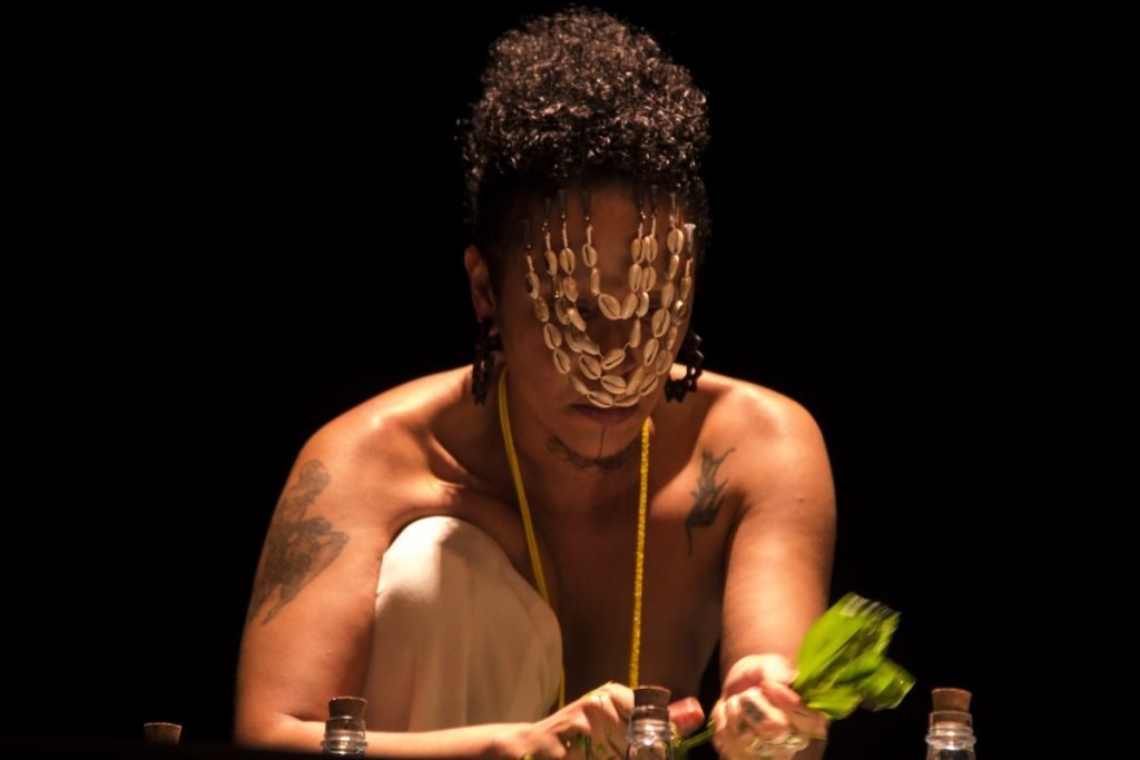 Castiel Vitorino Brasileiro (1996). Artista visual, macumbeira e psicóloga formada em Universidade Federal do Espirito Santo. Atualmente mestranda no programa de Psicologia Clínica da PUC-SP. Vive a macumbaria como um jeito de corpo necessário para que a fuga e o descanso aconteçam. Dribla, incorpora e mergulha na diáspora Bantu, e assume a vida como um lugar perecível de liberdade. Atualmente, desenvolve estéticas macumbeiras de sua Espiritualidade e Ancestralidade Travesti. Idealizadora do projeto de imersão em processos criativos decoloniais Devorações. Nasceu em Fonte Grande. Vitória/Espirito Santo – Brasil.